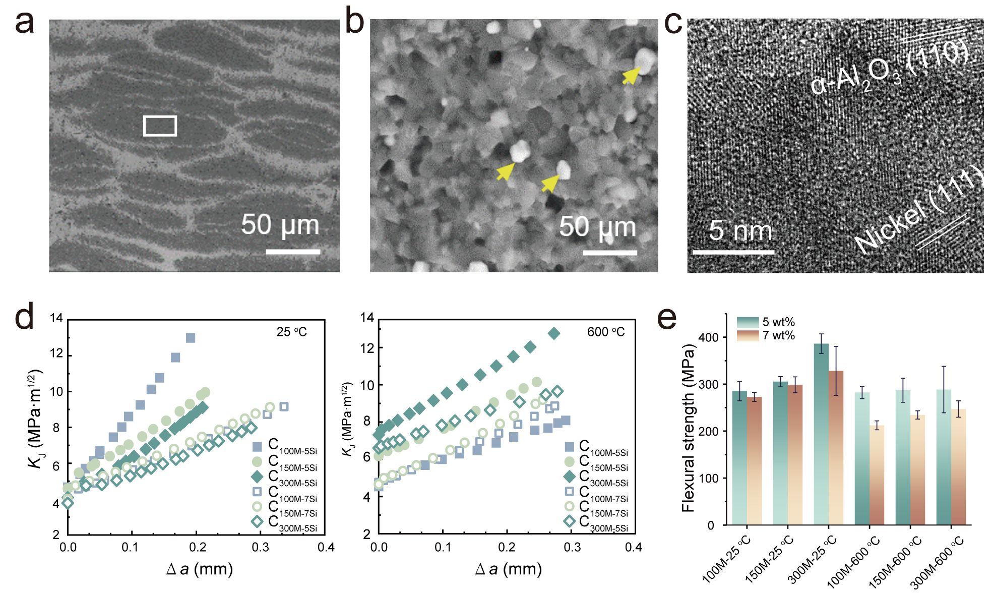 图2.仿珍珠母陶瓷—金属复合材料的多尺度结构及高低温力学性能。(a)抛光后的仿珍珠母陶瓷金属复合材料的扫描电镜照片;(b)金属镍渗入到陶瓷片层中的扫描电镜照片;(c)金属镍和陶瓷界面的高分辨透射电镜照片;(d)不同陶瓷片大小的复合材料在高低温下的裂纹扩展过程R曲线;(e)不同陶瓷片大小的复合材料在高低温下的弯曲强度。