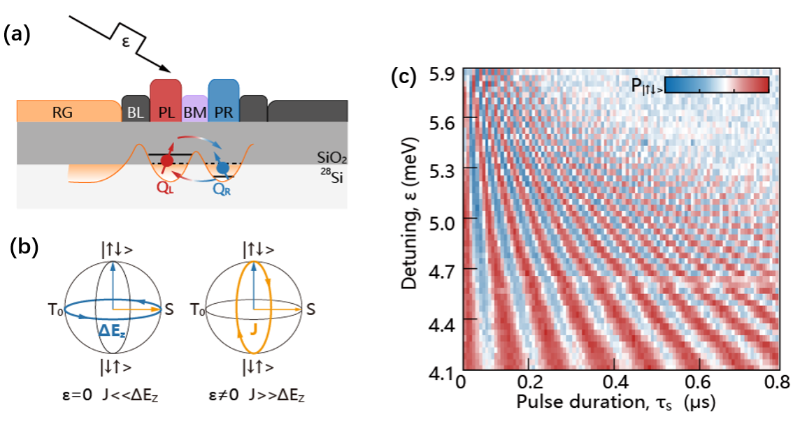 图:两量子比特SWAP门的实现,(a) 硅MOS结构双量子点器件的横截面图以及SWAP门操作示意图;(b) 单自旋两量子比特系统的布洛赫球在不同参数区间受调控过程的示意图;(c) 两个量子比特在不同操控波形时长和振幅的变化下,自旋状态连续交换翻转的实验测量结果,为SWAP门操作实现的直接证据。