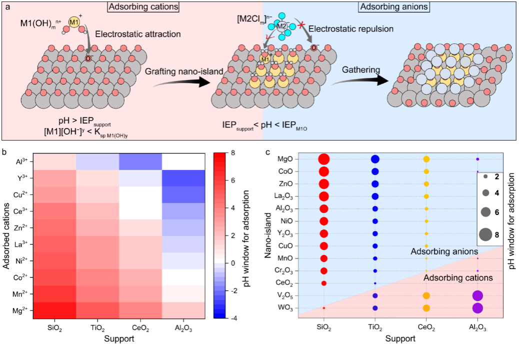 为了构筑纳米岛结构催化剂,研究人员首先在氧化物与载体间构建强吸附作用,通过高温受控团聚获得小尺寸、高密度的氧化物纳米岛。与常规的多组分催化剂相比,纳米岛结构催化剂创制的精髓在于实现金属颗粒在纳米岛上的精准落位。为此,研究人员巧妙地引入电性匹配原理,利用载体与纳米岛间的电性差异窗口构建定向吸附作用,使金属离子优先落于纳米岛上;结合溶剂蒸发,驱动金属离子向纳米岛周围富集。经过高温氢气处理,还原得到被锚定在纳米岛上的超细金属纳米颗粒。基于以上思路,研究人员发展了纳米岛结构催化剂的合成库,其中涵盖了常见的催化剂载体,氧化物纳米岛以及活性金属(图2)。