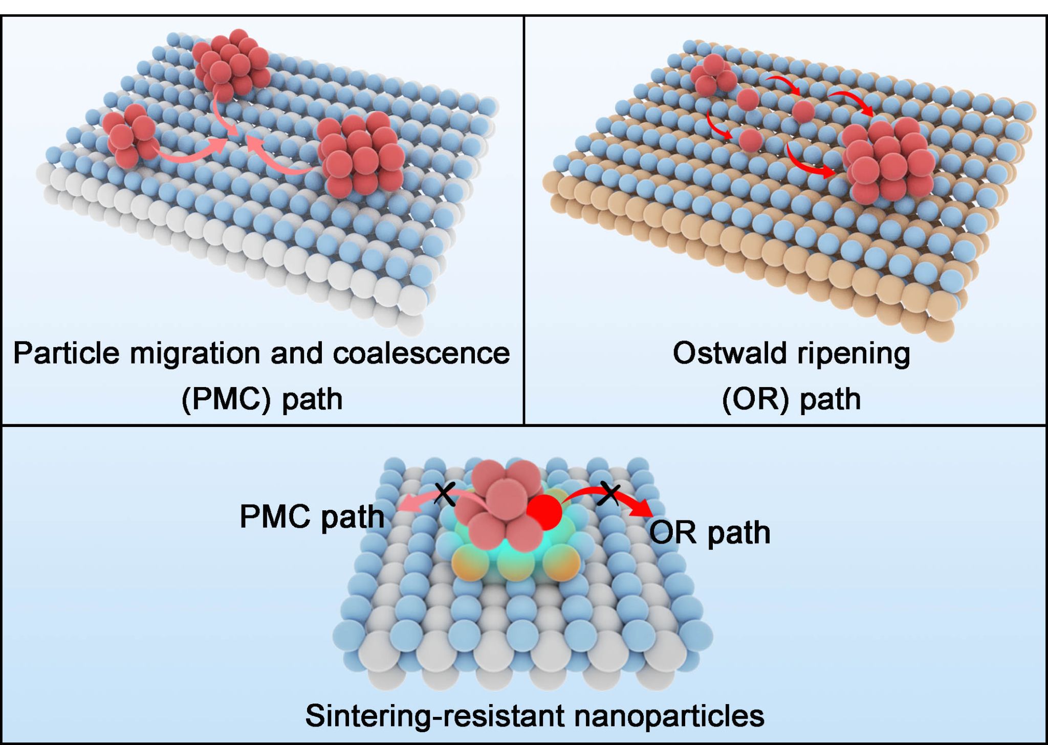 针对这一难题,研究人员基于对烧结路径的深入理解,创制了一种纳米岛结构催化剂。具体而言,该团队在催化剂载体与金属纳米颗粒之间嵌入一种均匀分布、小尺寸且互不相连的金属氧化物团簇,其因岛状结构被命名为“纳米岛”。相较于载体,纳米岛可实现对纳米颗粒更强的锚定作用,因此颗粒无法通过整体迁移(PMC)的路径烧结。此外,纳米岛互不相连的结构特征使得从颗粒表面脱离的金属原子难以跨岛迁移,从而抑制了Ostwald熟化(OR)。通过同时切断两种烧结路径,纳米岛结构有望显著提升超细金属纳米颗粒的抗烧结性能(图1)。