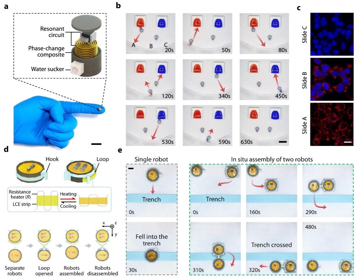 研究团队提出的动态重编程磁控软体机器在多场景应用中展现出显著优势,从单机多模态变形到多机选择性驱动与协作,从靶向送药到生物实验,实现了多场景应用的突破。为了展示其多模态变形的能力,研究团队开发了一种基于机械臂的磁控系统和小型化设计的轮式磁控机器人,在胃部环境中,轮式机器人可通过动态磁化控制实现多目标药物释放,精准定位病灶区域,实现了其在精准医疗与靶向送药中的应用。此外,通过动态重编程策略,研究团队实现了多机系统的选择性驱动与协作。在生物实验遥操作中,微型化设计机器人可分别携带不同试剂,在细胞培养场景中实现选择性染色,分别标记细胞骨架与细胞器。还通过机械连锁机制,使多个机器人间能够动态组装/解离,形成适应任务需求的复合结构(如跨越沟槽的加长体),突破单体尺寸限制,提升系统可扩展性。