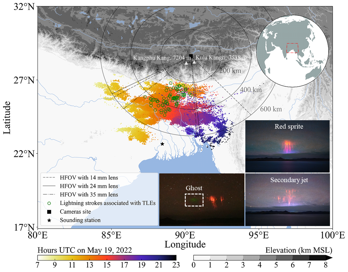 研究发现,母体闪电主要为大峰值电流的正极性地闪,发生在从恒河平原延伸至青藏高原南麓的中尺度对流复合体层状云降水区。研究观测记录了南亚单次雷暴过程中最多的精灵闪电,表明该地区雷暴具备与美国大平原和欧洲近海雷暴相似的中高层放电能力,甚至能够孕育出更复杂的放电形态,它们产生的物理化学效应对圈层耦合可能存在重要影响。