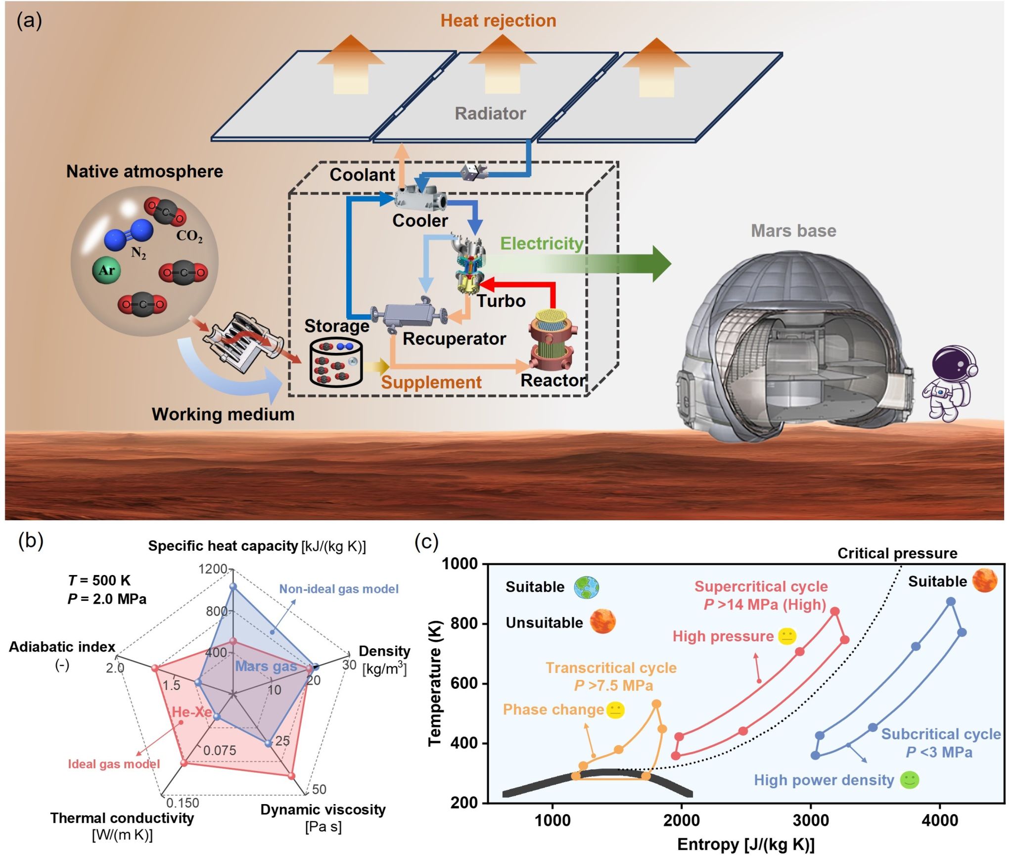 对于未来火星科考站核堆能源系统,工作介质是二回路热电转换的能量载体,非原生工作介质在火星极端服役环境具有潜在的泄漏问题。为了实现火星可持续能源供应,研究团队从“因地制宜”的思路出发,基于CO2工质优良的热功转化性能基础,开创性提出火星气体资源化利用的热电转化新概念,利用丰富的大气资源解决工质的供应管理问题。