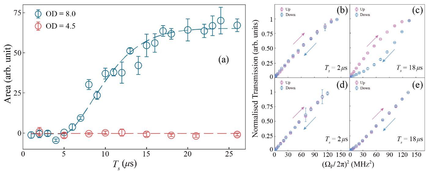 图3:迟滞动力学。(a)为不同原子密度情况下迟滞环的面积与扫描时间的关系。(b)–(e)为不同实验条件下的迟滞轨迹。