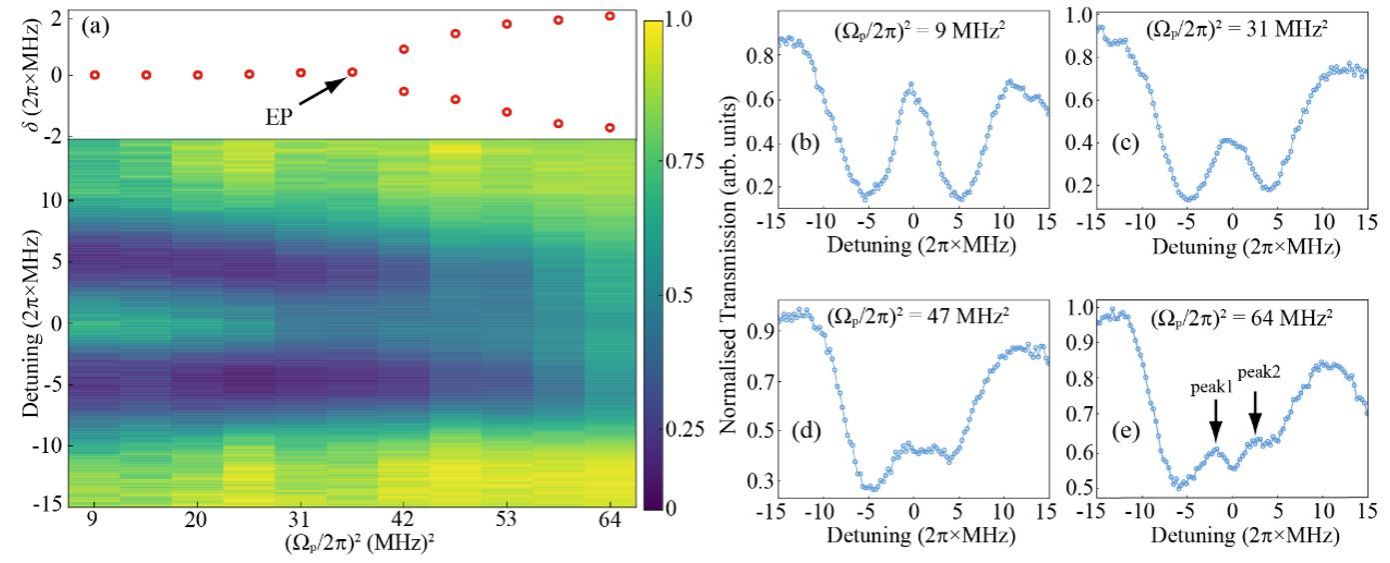 图2:实验测量的相图。(a)为原子响应谱随探测光强度的变化关系,透射峰的分裂表明系统经历了奇异点;红色点表明透射峰的偏移。(b)–(e)为不同探测光强下测得的原子响应谱,展现了奇异点附近的光谱特征。