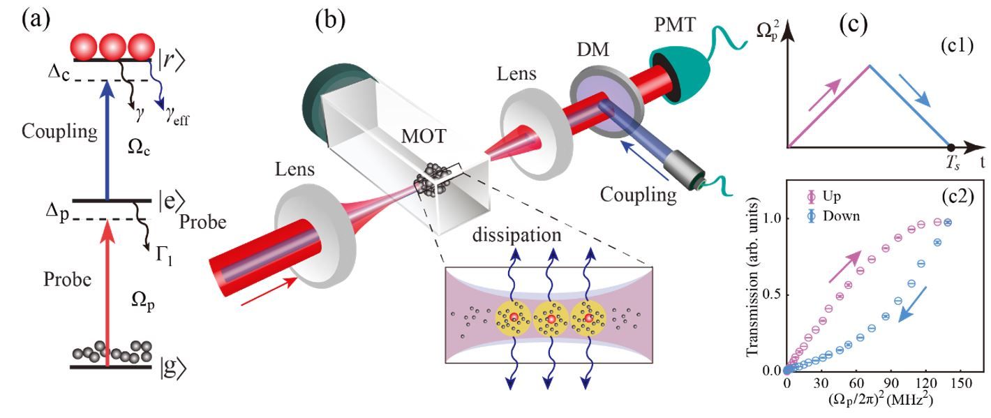 图 1 :物理模型图。(a)为双光子激发能级示意图。(b)为实验装置示意图,里德堡原子间相互作用会引起额外的耗散从而引起非厄米效应。(c)为通过正向和反向扫描探测光光强,系统的透射信号呈现出明显的迟滞轨迹,进一步揭示了非厄米动力学特性。