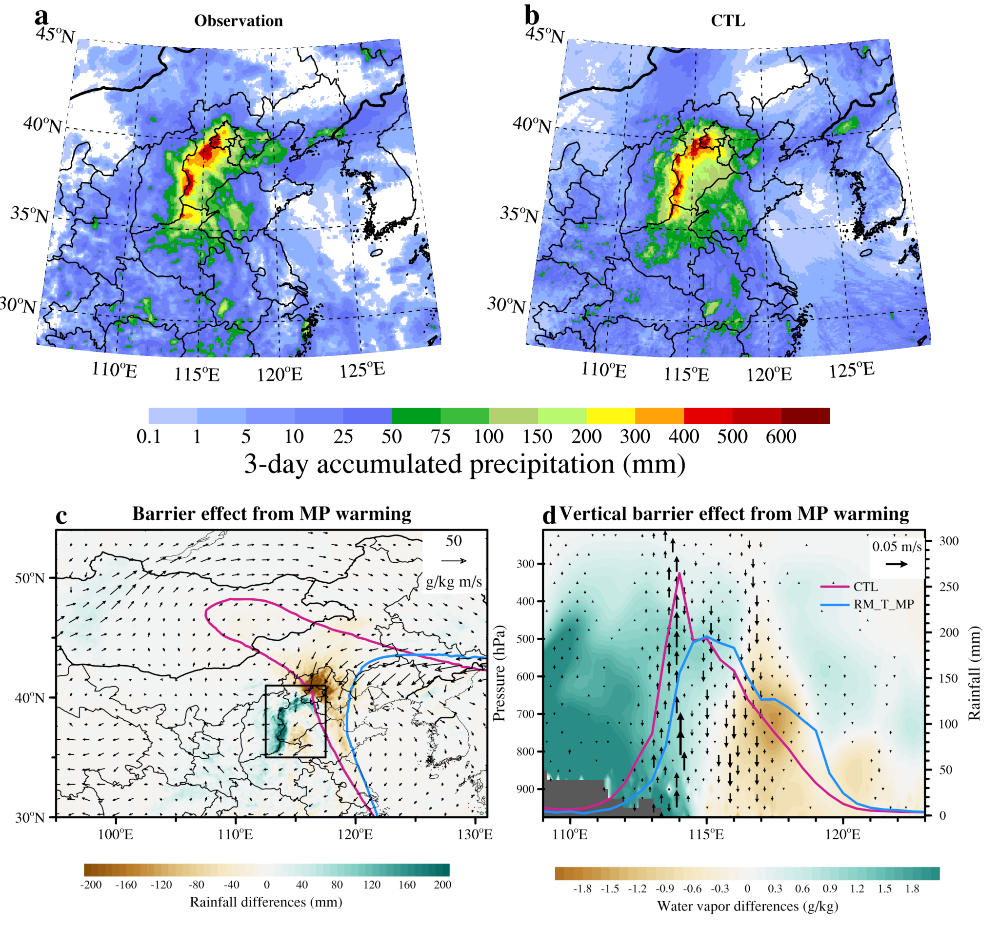 远在蒙古高原的快速增温,是如何影响到数百公里之外华北地区的这场暴雨呢?赵纯教授团队利用其发展的全球变分辨率大气物理化学耦合模式(iAMAS),在国产神威超算支持下,精准地模拟再现了“23.7”极端降雨过程,模拟结果在降雨落区、强度和时空演变上都与实况观测高度吻合。基于高精度的模拟,研究团队基于国际前沿的“故事线”(storyline)气候归因方法,通过设计对比实验,发现在导致此次降雨极端化的诸多因素中,蒙古高原的异常快速增温趋势扮演了关键的“幕后推手”角色。