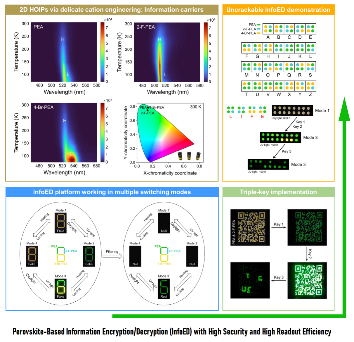 这项成果所展示的基于钙钛矿材料刺激响应发光性质的、采用三重“钥匙”运作于多模态下的信息加密/解密新策略和新方案,不仅具有高的信息安全性,而且具有高的信息提取效率,为信息安全领域的光学加密相关研发提供了新的可能性。