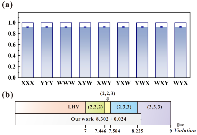 量子非局域性是量子力学最深刻的现象之一,揭示了量子物理与经典物理本质上的区别,同时也为量子信息的安全提供了保障。长期以来,非局域性的实验研究主要集中在两个粒子和二维系统(即“量子比特”)之间。而真实世界中的许多量子过程涉及多个粒子和更高维度,这意味着高维多体系统不仅是基本科学问题的重要延伸,也为提升量子系统的信息处理能力、抗干扰能力和通信容量提供了可能。然而,由于高维度与多体系统带来的复杂度急剧增加,这一领域的实验研究一直面临巨大的挑战。