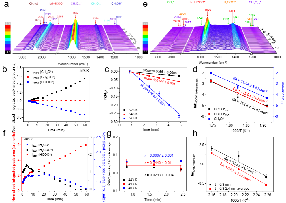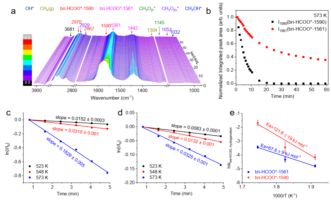 明确催化剂活性位一直是多相催化基础研究的核心目标之一,但由于工作催化剂复杂性,这始终是一项长期的挑战。催化剂的活性位点会随着所催化的反应不同而发生变化。ZnO-ZrO2复合氧化物是新型的高效催化CO2和CO加氢制甲醇的催化剂,但其活性位和反应机理存在争议。黄伟新教授课题组之前发展了利用快扫原位漫反射红外光谱表征工作催化剂表面基元反应动力学来可靠研究工作催化剂表界面化学的研究策略(Angew. Chem. Int. Ed. 60 (2021) 6160; ACS Catal. 11 (2021) 10014; J. Phys. Chem. Lett. 14 (2023) 7229; ACS Catal. 14 (2024) 1922)。在该研究中,我们利用该策略,研究了工作条件下Zn20Zr80催化COx加氢反应的表面基元反应动力学,获得不同表面甲酸盐关键中间体加氢反应活化能(图2和3),以此作为实验证据可靠关联催化剂结构表征、宏观反应动力学和理论模拟结果,明确识别出Zn20Zr80催化剂催化CO2加氢制甲醇反应活性位和活性甲酸盐物种分别为表面仅具有Zn-O-Zr配位结构的Zn1单原子(-Zr-O-Zn-O-Zr-O-Zr-)和在邻近Zr位点吸附的桥式甲酸盐物种,而催化CO加氢制甲醇反应活性位和活性甲酸盐物种分别为表面同时具有Zn-O-Zr和Zn-O-Zn配位结构的部分还原Znn团簇(-Zn-O-Zn(-O-Zr-V?-Zr-)-O-Zr-O-Zr-)和在邻近Zr位点吸附的桥式甲酸盐物种。