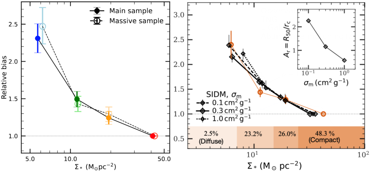 图片1 :(左图)观测中的孤立矮星系偏置和质量面密度的关系;(右图)基于ELUCID 模拟和自相互作用暗物质(SIDM)模型预测的孤立矮星系偏置(黑色线条)和观测结果(橙色线条)的对比。其中插图给出了由该工作约束的星系半径-SIDM暗晕核心半径比值随自相互作用散射截面的变化。