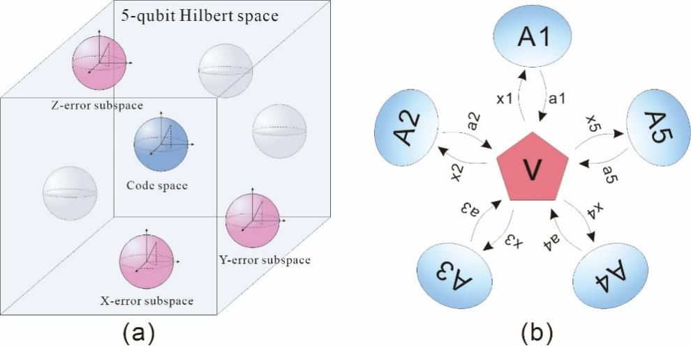 图1(a)逻辑子空间和(b)量子自检验示意图