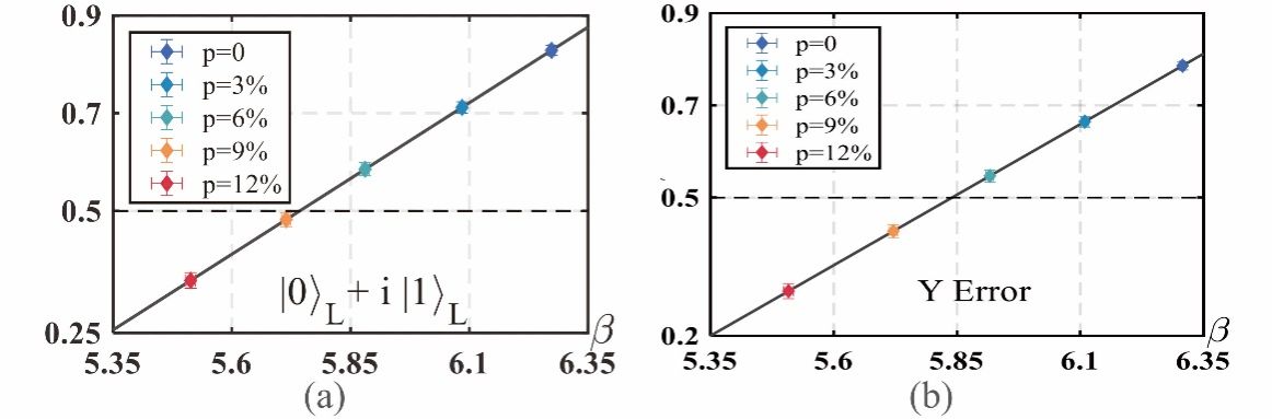 图2(a)逻辑量子态及(b)其在发生单比特错误时不同噪声条件下的量子自检验