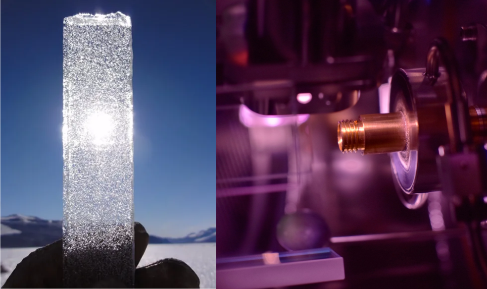 图1(左图),研究人员展示南极冰芯以及冰芯中的包裹气泡;