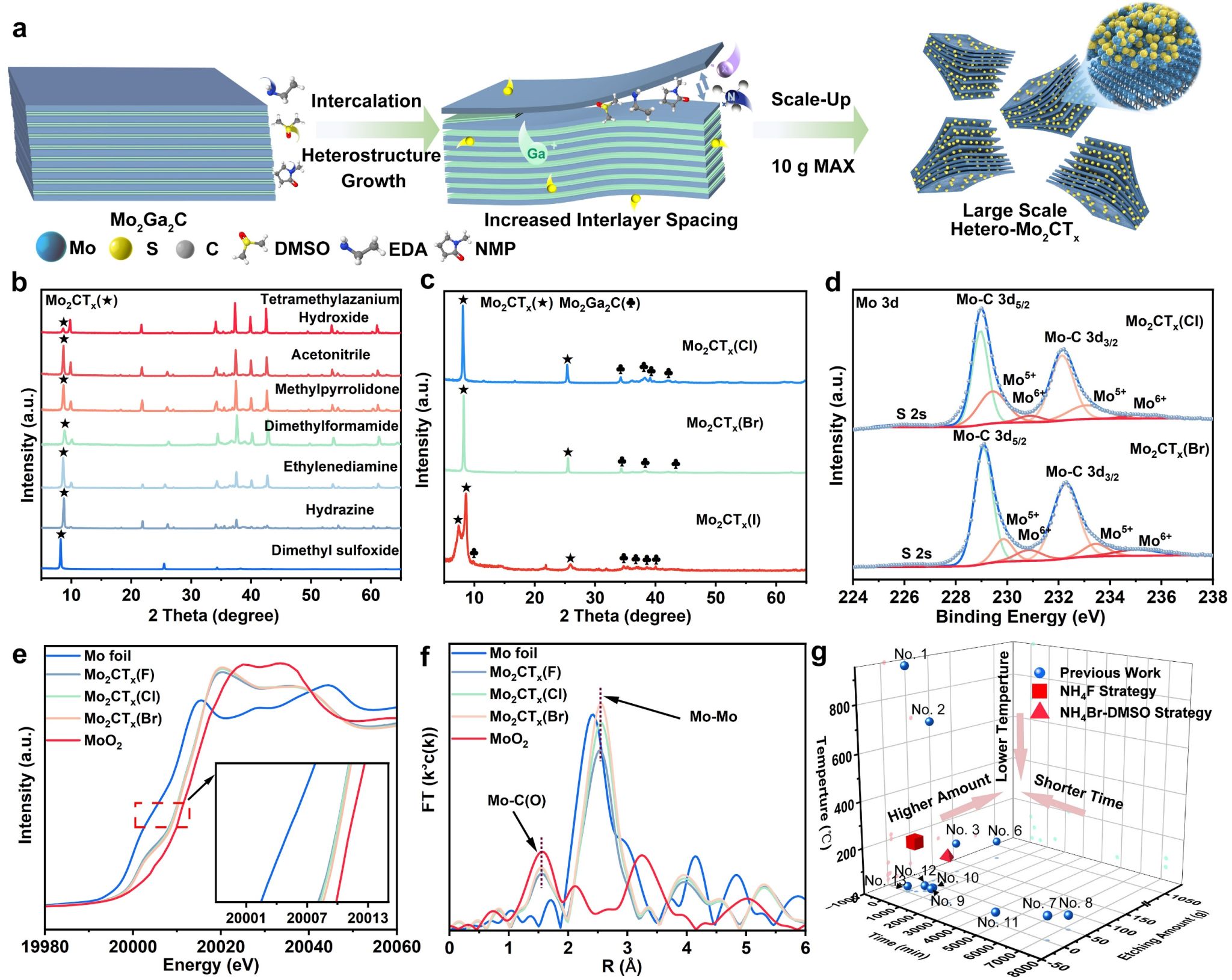 研究团队首先通过理论计算,揭示了卤素离子刻蚀机理及氟化铵分子在刻蚀反应热力学和动力学上的优越性。基于模拟数据指导,首次提出了氟化铵水热刻蚀新策略,并在220°C条件下 6小时完成了10克Mo?Ga?C前驱体的刻蚀,实现了单批次产量超过5克的碳化钼MXene的可控制备。