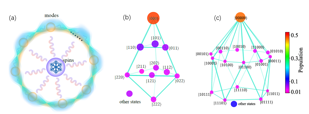 图(a):实验系统示意图,通过受控的耦合束缚离子的多个振动模式与耗散的自旋,实现稳态多模纠缠制备。图(b,c):实验制备的三模和五模压缩态的部分测量结果,展示系统在多个正交状态的显著布居。