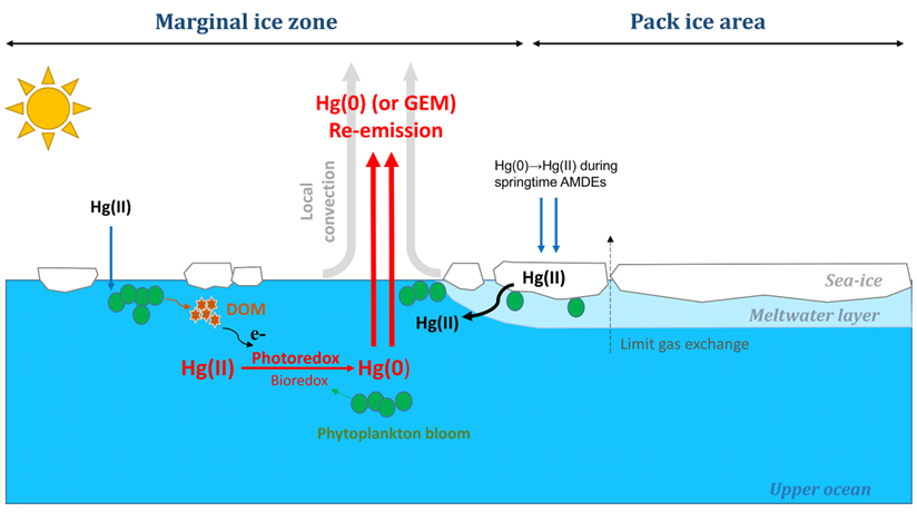 北极夏季的“汞反弹”是北极环境汞循环的一种特殊现象:每年7月至8月,大气中气态元素汞(Hg(0)或GEM)浓度会显著飙升,甚至达到北半球背景值的近2倍水平,成为大气“汞源”。夏季“汞反弹”及其传输将使得北极沿海地区,特别是北极苔原地区的Hg(0)干沉降通量显著增强,增加北极陆地生态系统的潜在汞暴露风险(Huang et al., Nature Communications 16, 903, 2025)。研究团队曾在国际北极气候研究多学科漂流冰站观测计划(MOSAiC)期间在北冰洋大西洋方向开展了观测,发现夏季海冰边缘区(MIZ)显著的大气汞排放是北冰洋夏季“汞反弹”现象的重要成因(Yue et al., Nature Communications 14, 4887, 2023)。然而,海冰边缘区汞排放为什么会更加显著?其关键驱动机制目前仍不清楚。值得注意的是,北极夏季“汞反弹”现象不仅具有空间热点特征(集中于海冰边缘区),在时间上也具有较明显的窗口期,通常在7月中旬至8月初达到Hg(0)浓度峰值,随后逐渐下降并在8月中旬之后趋于平稳。上述特征很可能是进一步了解夏季“汞反弹”现象关键驱动因素的切入点。