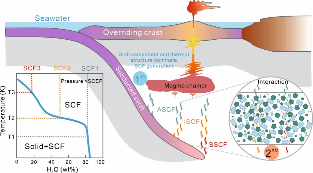 超临界流体(supercritical fluid) 是水与硅酸盐熔体在高温高压下完全互溶形成的一种特殊流体。因其高溶质迁移率和低迁移粘度的物理化学特质,具有极强的元素迁移能力,被认为是地球内部物质循环与能量交换的关键载体。超临界流体的成分连续变化,受到周围共生岩石的缓冲控制,随温度升高从富水端元逐渐过渡到富硅酸盐端元 (图1)。其中富水超临界流体被预测为岛弧玄武岩地幔源区的重要交代媒介,并且其超强的萃取能力也有利于关键金属富集和运移。然而,富水超临界流体形成于很难直接窥探的高压高温地幔中,其H2O的主体部分也难以在地质历史中保存下来。因此,富水超临界流体的性质以及在这些关键科学问题中扮演的角色尚未充分了解。