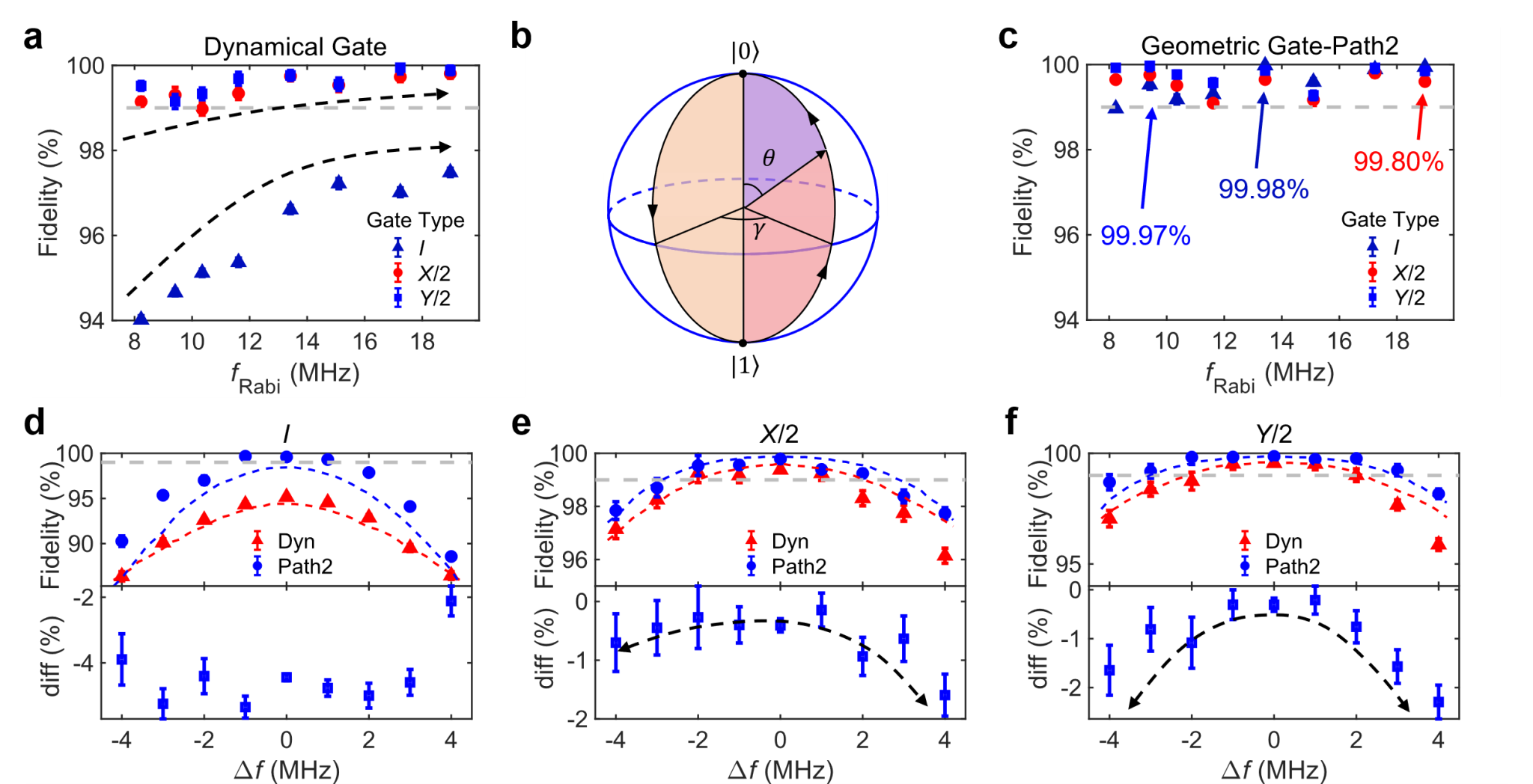 图1. (a)传统动力学门在不同工作条件下的操作保真度。(b) 几何量子门的路径示意图。(c) 几何量子门在不同工作条件下的操作保真度。对比(a)和(c)发现,随着在拉比频率增大,传统动力学门操作保真度有所提升但逐渐饱和,几何量子门的操作保真度始终稳定保持在99%之上。 (d)-(f) 人工添加不同强度的比特频率偏移噪声后,传统动力学门与几何量子门性能对比。几何量子门的保真度始终显著高于传统动力学门,且随着噪声增大,动力学门的操作保真度下降更明显。