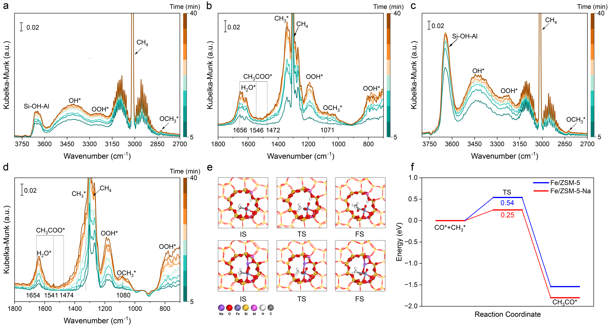 富含钠改性骨架铝的分子筛负载铁催化剂在低温甲烷氧化制乙酸反应中展现出优异性能。该催化剂在50摄氏度下实现了比未改性催化剂更高的反应活性,且在多轮循环中能稳定保持活性和选择性(图1)。结合谱学表征、原位漫反射红外光谱实验和理论计算,研究人员发现富含钠的改性骨架铝能向铁物种提供电子,形成富电子铁活性位点。这些富电子位点显著降低了甲基中间体与一氧化碳在铁位点上经碳-碳偶联形成乙酰基中间体的反应能垒,从而有效促进了乙酸的合成(图2)。本工作成功开发了一种用于甲烷选择性氧化制乙酸的高效催化剂,并深入揭示了驱动该过程的金属活性位点与分子筛载体间协同作用机制。