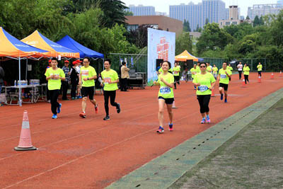 竞赛组9:30鸣哨开跑,20名师生飞快地冲出起跑线。5分钟后,100多位畅跑组的师生也跑上了跑道。赛事组织方特意设置了隔离桩,两组运动员分属不同的跑道范围,既不会相互干扰,又可以彼此加油鼓气。