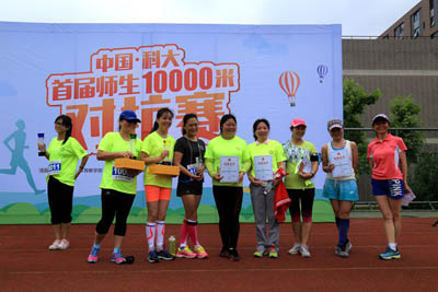 随着竞赛组周道洋同学以40分42秒的优秀成绩率先冲过终点线,全场响起热烈的欢呼声。紧接着,第二名、第三名……越来越多的师生完成比赛。女老师女学生同样不甘示弱,李丹丹同学以51分9秒的成绩完成比赛,超越了很多男生。师生们陆续完成了万米赛程,获得完赛证书,竞赛组师生男女前三名还分别获得了奖杯。