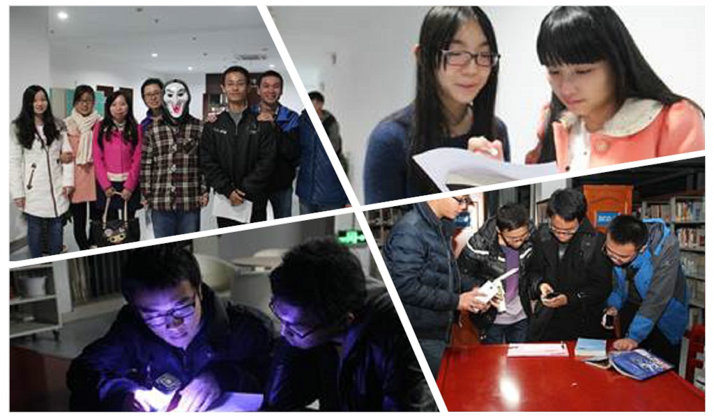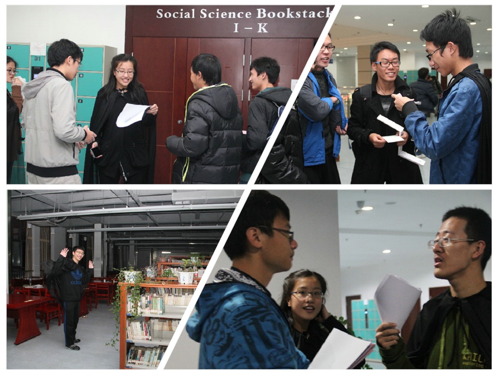 11月22日,第一次“图书馆奇妙夜——密室逃脱”活动正式开展。命题组的志愿者们为活动精心准备了一套套精彩纷呈的题目,现场组作为NPC的志愿者们也都尽心尽责,给队伍必要的提示,并且在各场次之间安放道具以保证活动的顺利进行。