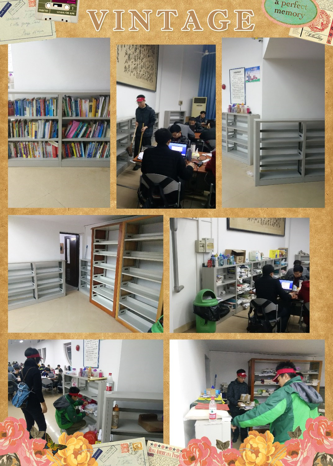 1月11日和13日晚九点,校芳草社图书馆志愿服务分队的志愿者们在得到图书馆同意和支持下,分别对西区图书馆一楼自习室和东区图书馆五楼自习室内的储物架进行了一次清理。