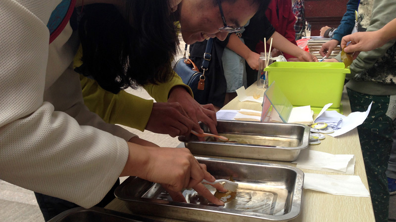生命科学学院提供的实验是“制作叶脉书签”。工作人员事先将树叶用碱水煮好,同学们都在仔细小心的刷掉叶片,不一会儿就只剩下了细密的叶脉。