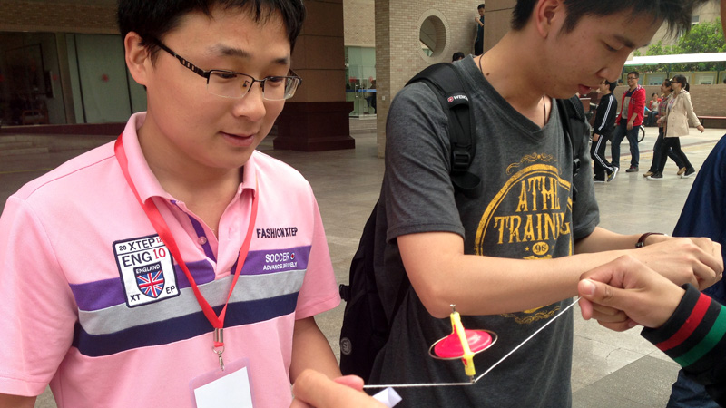 工程科学学院提供的实验是“疯狂的陀螺”。工院学长带来了大家小时候都玩过的陀螺,引起了许多同学的关注,场面格外热烈。在工作人员的指导下,同学们纷纷利用陀螺完成了指定动作,人群中不时传出胜利的欢呼!