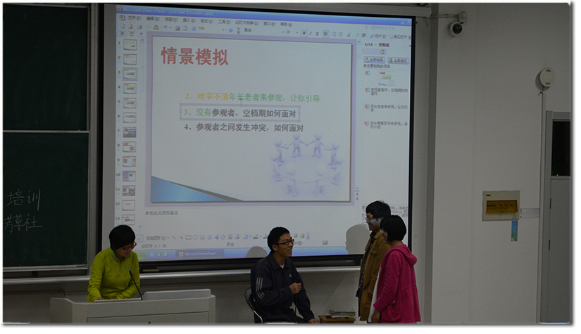 第一次演示后,三位往届有丰富经验的志愿者又为大家展示了如何去面对耳背又吐字不清、略带方言的老者,如何面对没有参观者的空档期以及怎样正确处理参观者之间发生冲突的问题。现场大家讨论热烈,纷纷感叹受益匪浅。