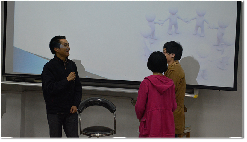 讲座开始不久,宋老师就安排了几个情景模拟,通过现场演示告诉大家在活动进行中时,我们可能会遇到什么情况,以及应该如何去面对这些情形。第一个场景设置是一位家长带着小朋友前来向志愿者问路。现场由两名事先排练好的志愿者扮演家长和小朋友,再请一名没有经验的同学当志愿者,结果“家长”的几句话就把志愿者给问住了,这也反映出在活动中可能我们会遇到很多始料未及的问题。