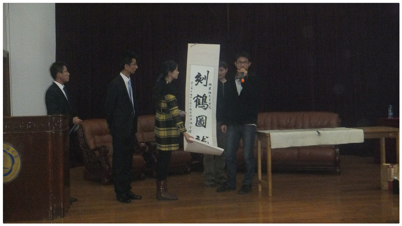 最后,双馨书画协会的会长连少鹏同学为孙校长现场献字,“刻鹤图龙”四个字表达了对同学们及新东方的美好祝愿。