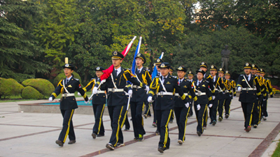 7时整,升旗仪式正式开始。升旗方阵踏着豪迈而庄重的步伐走向旗台。伴着响彻校园的嘹亮国歌,所有同学一齐把神圣的军礼和澎湃的热情献给国旗。鲜艳的国旗在大家的肃穆凝视中徐徐升起,国歌激昂的旋律在广场上方久久回荡。接下来,在铿锵的校歌《永恒的东风》中,校旗、院旗在蔚蓝的天空下迎风飘扬。