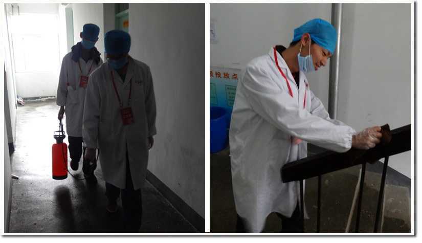 20 日早上,消毒小组的队员们穿着白大褂,戴上口罩、帽子和手套等防护用具,“全副武装”地进入东区的宿舍楼。志愿者们以两人或三人为一小组,对各个楼层的厕所、浴室及走廊的地面喷洒消毒液,并用浸泡过消毒液的毛巾擦拭了扶手。活动得到广大同学的支持和欢迎,许多同学向志愿服务队询问消毒知识。4月21 日,另一个消毒小组对西区的各个本科生宿舍楼进行了消毒。
