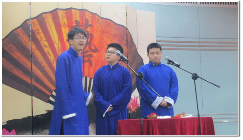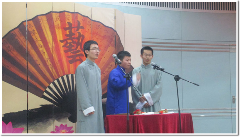 接下来的一段群口相声,由相声社社员杜俊腾、刘高正、张宝昌三位同学表演的《金刚腿》,三人在表演中“冲突不断”,笑料百出。
