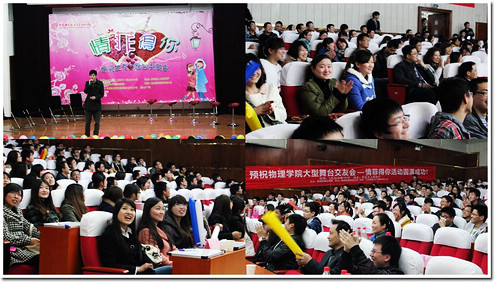 3月30日晚,由物理学院分团委主办、物理学院研究生会承办的大型研究生专属舞台交友会“情菲得你”在东区水上报告厅成功举办。“情菲得你”面向合肥各大高校研究生单身男女,现场有来自科大、安大、安医大等高校的男女嘉宾各6名。交友会上,男女嘉宾鼓起勇气追求真爱,亲友团在台下呐喊助威,主持人个性解说,情感顾问宋怡老师精彩点评,现场观众热情互动,场面十分火爆。