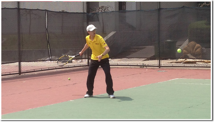 比赛从一开始就十分激烈,无论自己的对手是强是弱,每位参赛选手都在尽自己全力去挥动每一次球拍,发挥出自己最高的水平,在比赛中收获,在比赛中成长。场下的观众们也不禁为场上选手们的每一个精彩的回球而欢呼,或是为一个失误而惋惜。下图为“网球王子”林智中在第一场小组赛比赛中的一个全力发球。