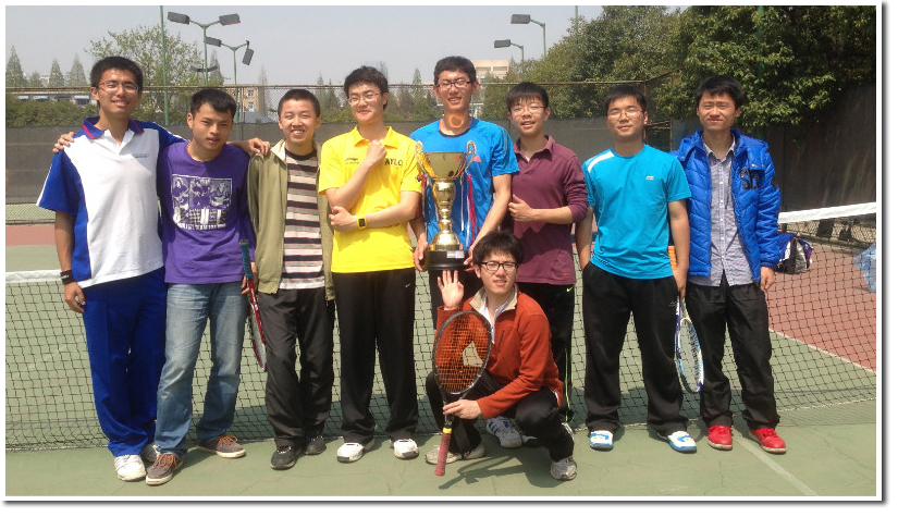 在1/4决赛和半决赛过后,之前已经蝉联2次冠军的宋亮以及非种子选手黄尤会师决赛。在这场实力的对决中,宋亮凭借他稳定的发挥、犀利的回球、丰富的比赛经验以6:2的比分夺得了冠军,成为了中科大网球巡回赛的三冠王。下图是决赛后的小合影,后排右四是冠军宋亮,左四是亚军黄尤。