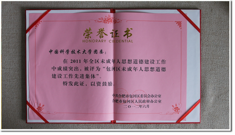 日前,在2011年全区未成年人思想道德建设工作评比中,我校团委成绩突出,被评为“包河区未成年人思想道德建设工作先进集体”。