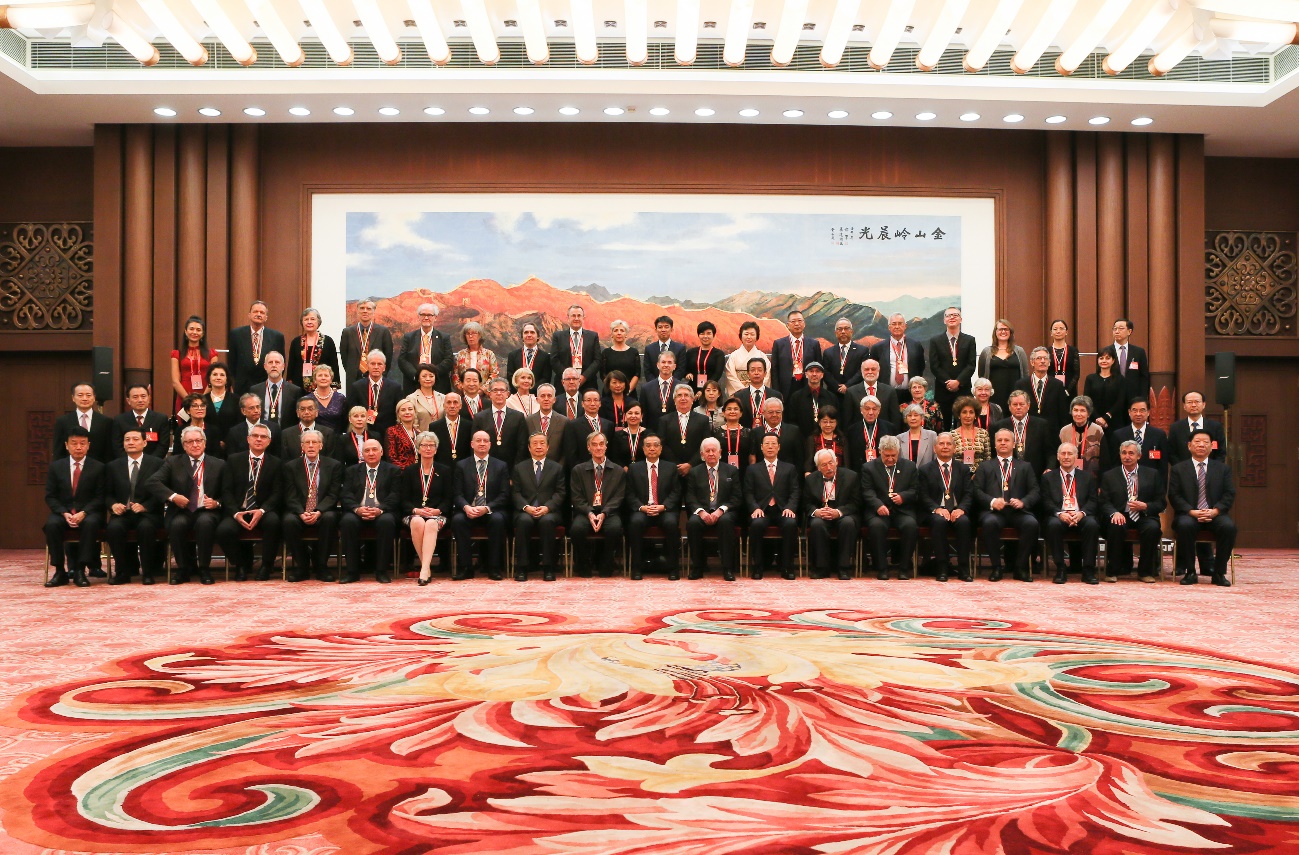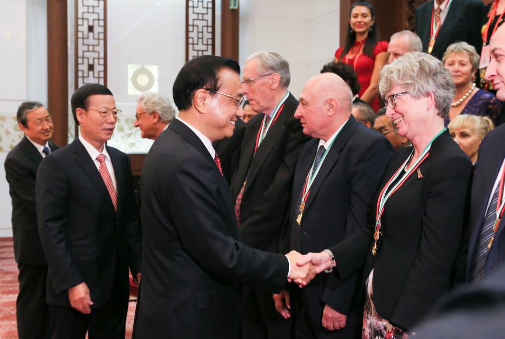 李克强、张高丽、马凯与获奖者合影(前排左七为科瑟-赫英郝斯教授)