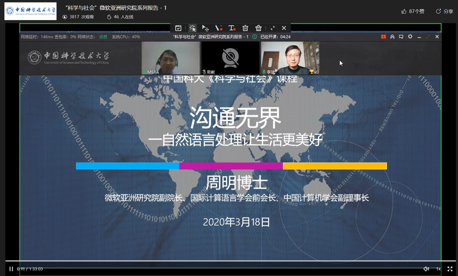 3月18日,微软亚洲研究院副院长、国际计算语言学会(ACL)前任会长、中国计算机学会副理事长、中国中文信息学会常务理事、首都劳动奖章获得者周明博士通过学校网课平台为我校信息与计算机类专业学生作“科学与社会”研讨课主题报告,报告题目是《沟通无界——自然语言处理让生活更美好》。这是由我校信息学院与微软亚洲研究院联合发起的系列报告的第一场,报告会由信息学院副院长李斌教授主持,来自信息学院、计算机学院、少年班学院的650多名本科生通过网络聆听了报告。