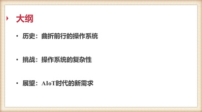 之后,陈海波教授正式开始报告。他从三个方面进行了阐述,先是回顾了在曲折中前进的操作系统的发展历史,接着分析了操作系统的复杂性,最后从AIoT(人工智能物联网)时代对操作系统的新需求出发,对未来的发展方向进行了展望。