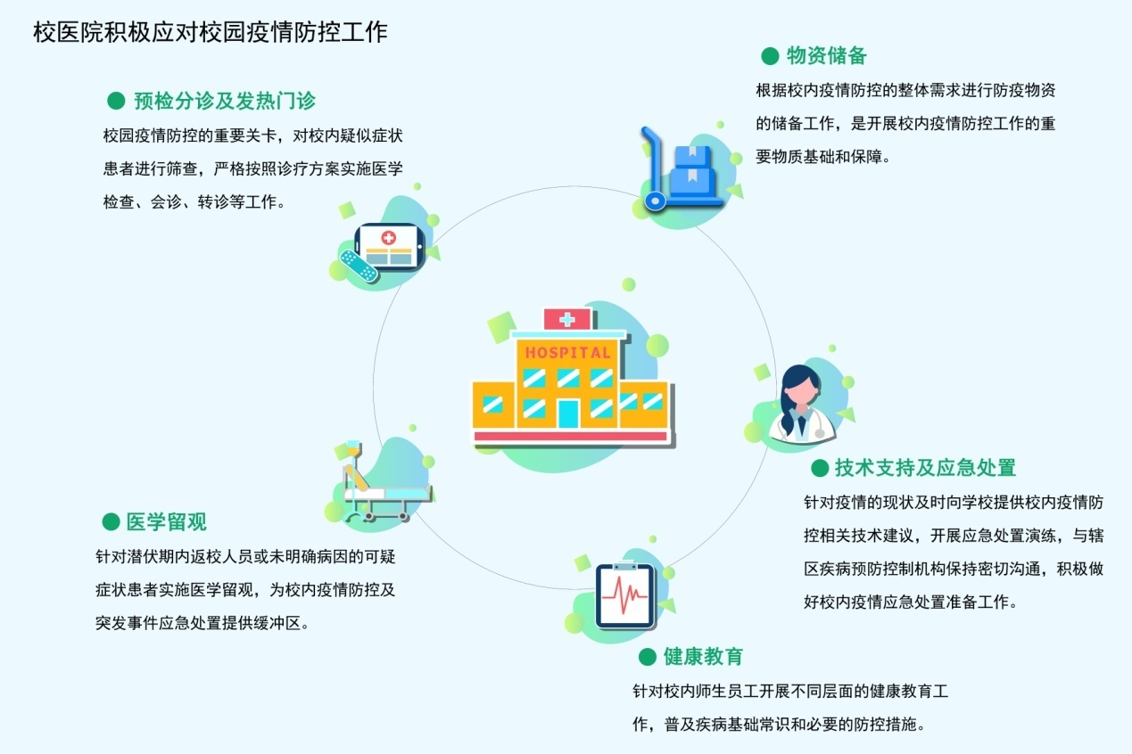 针对校内师生员工开展不同层面的健康教育,普及疾病基础常识和必要的防控措施是校医院的基本工作。多年来,校医院在校内师生中坚持开展健康教育课,进行急救知识培训等健康教育内容。疫情期间,校医院主动通过学校主页、医院网站和公众号发布了若干篇《关于防控新型冠状病毒感染肺炎的温馨提示》,向广大师生提供了新冠肺炎的基本知识和温馨的防控措施提示。此外,校医院还制作了《校内防疫须知》、《正确学习七步洗手法》、《口罩使用注意事项》、《常用物品消毒方法》、《大专院校新冠肺炎防控技术方案》等宣传海报和折页。我们还将在即将返校的学生中陆续开展防控知识的培训,从专业的角度提供科学、有效的防控指导。