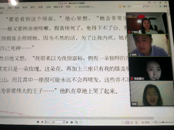 四月的线上读书沙龙活动共分4场,每场15人,均为本校学生;每场有两位同学担任主持人,同时推荐两本图书。推荐图书均来自于经典阅读书目——《围城》、《小王子》、《地球角落》、《慢煮生活》、《乖,摸摸头》、《解忧杂货铺》、《月亮与六便士》。疫情期间,为保障在校师生的借阅需求,校图书馆提供了丰富的馆藏数字化副本,从而保障了线上读书沙龙活动的顺利进行。活动的阅读书目均来源于校图书馆提供的馆藏数字化副本。每场的主持人在图书馆的电子资源库里下载所需书目的馆藏数字化副本,周一发送给参与的同学们,周日晚上七点半进行读书会活动。