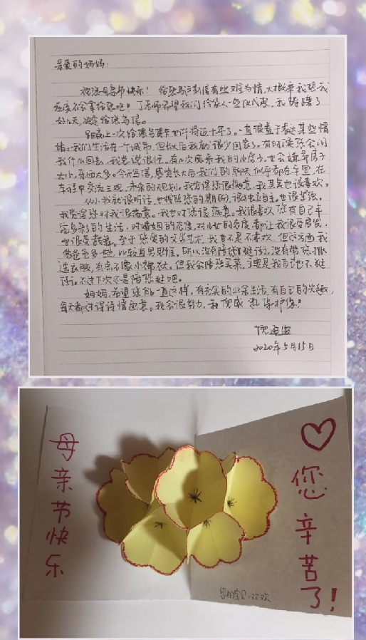 唐欢为母亲亲手折了一朵漂亮的花,并附上:母亲节快乐,您辛苦了!