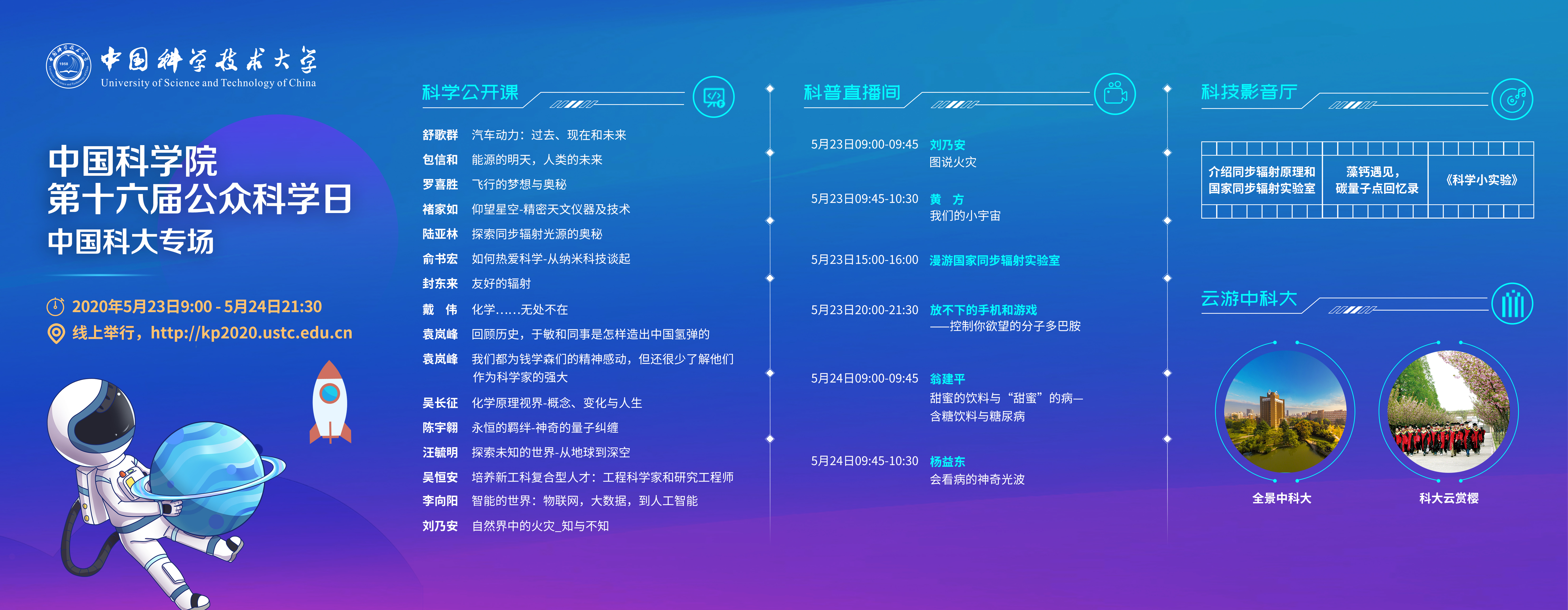 5月23日,中国科学院第十六届公众科学日中国科大专场活动(线上)在合肥拉开序幕。中国科大专场活动由科学公开课、科普直播间、云游中科大、科技影音厅等多个版块构成,以全部线上活动形式,全面展现中国科大近年来重大科技创新成果,描绘科技造福人类的美好愿景,激发公众尤其是青少年对科学的关注和兴趣。公众只需登陆网页http://kp2020.ustc.edu.cn,即可畅游神奇的科学世界。当天的直播观看及网站浏览数达到50000余人次。