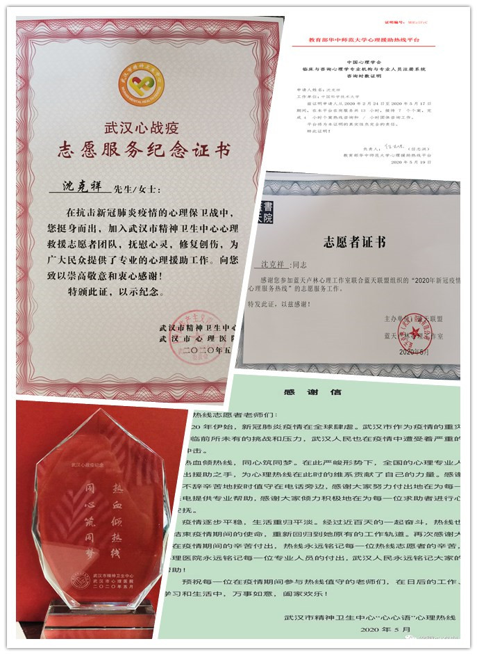 立足本校,奉献社会。沈克祥老师自疫情开始便积极投身社会志愿服务,先后参加教育部心理援助热线、武汉心理医院心理热线及合肥市心理危机干预热线。与全国4000余名志愿心理咨询师共同战斗,构筑起一道抗疫心理防线,每天为千余名心理求助者提供情绪疏导、情感支持及危机干预,促进受助者情绪稳定,维护心理健康。