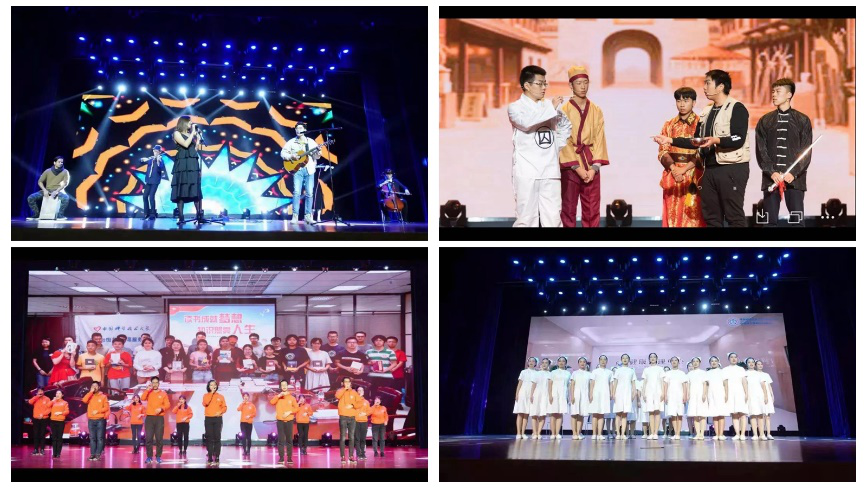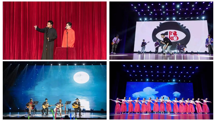 在第三篇章“瀚海揽月震霄汉”中,相声社带来的《炼金术士》,以生动幽默的演绎,收获了台下观众的阵阵掌声和欢呼。Fake乐队演奏的乐曲节奏欢快而奔放,具有极强的视听感染力。悠扬方舟乐队演奏的《我要你》,以悠扬舒缓的吉他弹唱,娓娓道来,沁人心脾。随后,由教工舞蹈团带来的现代舞《我的祖国》表达了科大教职工对祖国未来繁荣昌盛的美好祝愿。
