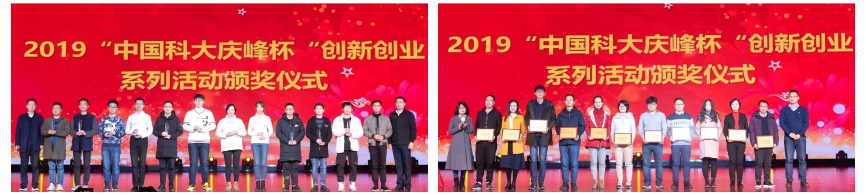 2019年“中国科大庆峰杯”创新创业系列活动刚刚结束,晚会现场还举办了优秀项目奖和优秀组织奖的颁奖仪式。获奖的项目负责人从徐景明、周宇手上接过奖杯,获奖的各学院团委书记从杨晓果、杨志伟手上接过奖牌。